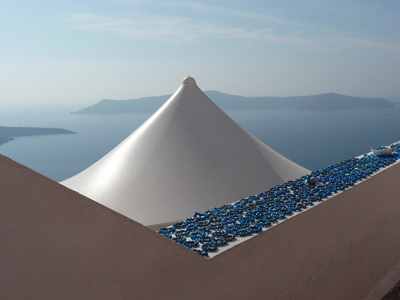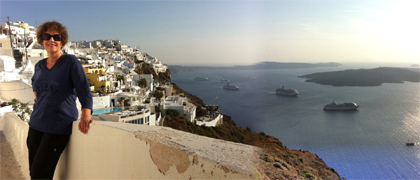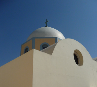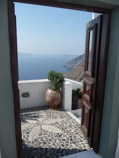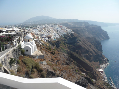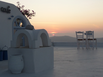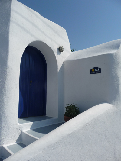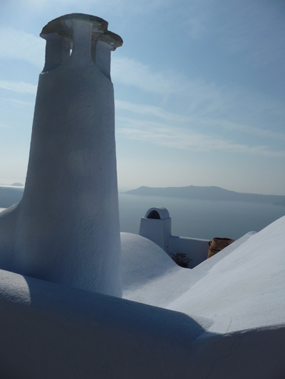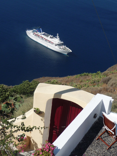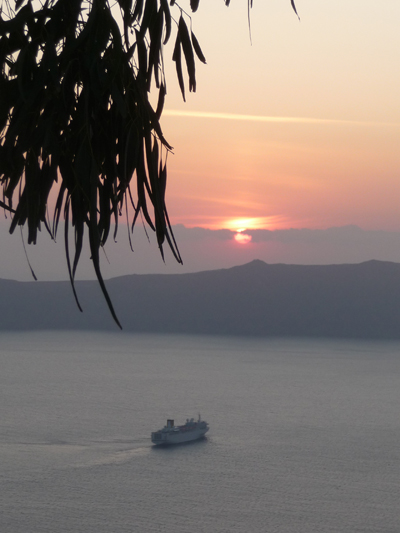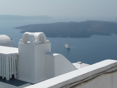 After dinner we walked slowly back under the soft lights of romantic Santorini. Sat out on the terrace for a while watching the lights of the cruise ships criss-crossing the calm Aegean, and then fell into the large, comfortable king-sized bed. |
